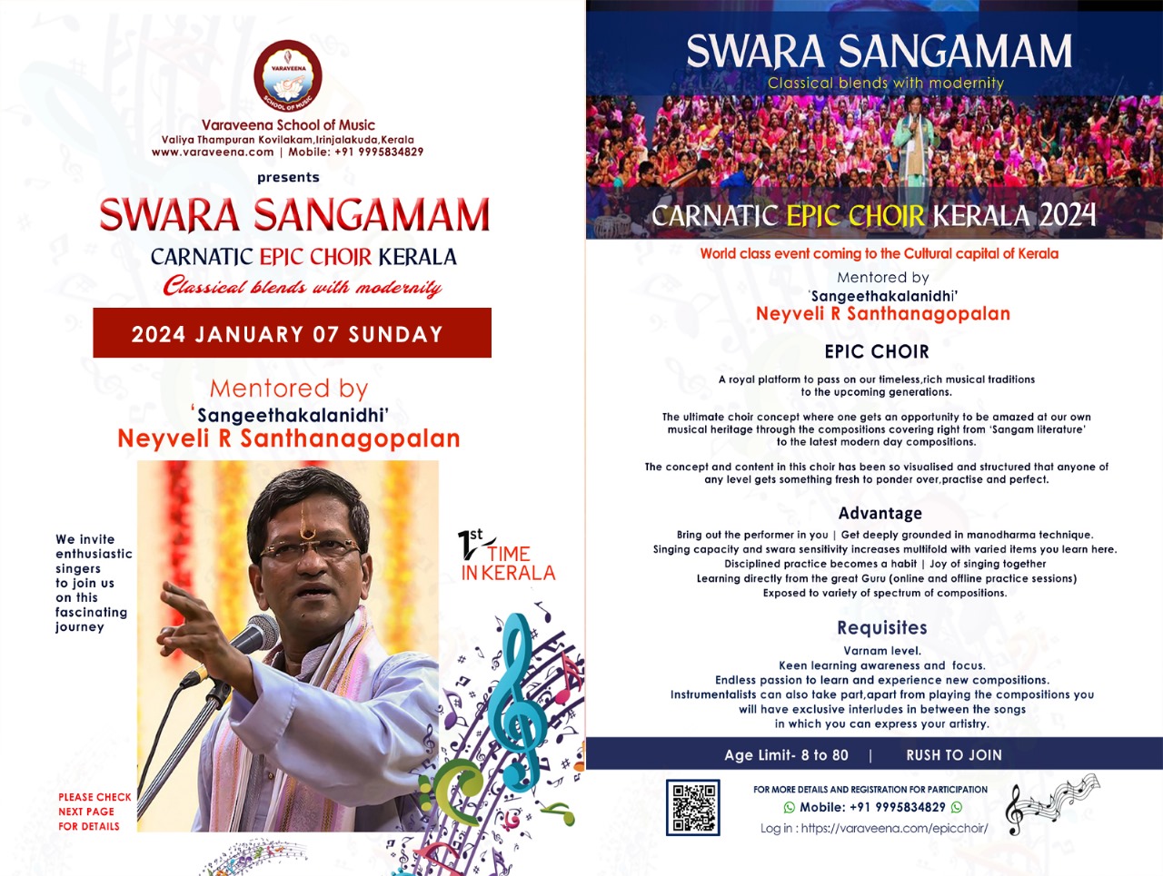 സംഗീതം ഹ്യദയങ്ങളെ ഒരുമിപ്പിക്കുന്നു എന്ന് സംഗീതജ്ഞൻ നെയ്വേലി സന്താനഗോപാലൻ. പാർശ്വഫലങ്ങളൊന്നും ഇല്ലാത്ത ഒരേ ഒരു മരുന്നാണു സംഗീതമെന്നും അദ്ദേഹം പറഞ്ഞു. ഇരിങ്ങാലക്കുട ആസ്ഥാനമായ വരവീണ സ്കൂൾ ഓഫ് മ്യൂസിക് അവതരിപ്പിച്ച സ്വര സംഗമം കർണാട്ടിക് എപിക് ക്വയർ ഓഫ് കേരളയിൽ സ്വര സംഗമം അവതരിപ്പിക്കുകയായിരുന്നു ഇതിൻ്റെ ഉപജ്ഞാതാവ് കൂടിയായ അദ്ദേഹം. കേരള സംഗീത നാടക അക്കാദമി തൃശ്ശൂരിലെ കെ.ടി.മുഹമ്മദ് തിയേറ്ററിൽ (റീജിയണൽ തിയേറ്റർ ) ആയിരുന്നു അപൂർവ്വവും വിസ്മയജനകവുമായ ഈ കലാനുഭവം. ലോകത്ത് 25 രാജ്യങ്ങളിൽ ഇതിനു മുമ്പ് എപ്പിക് ക്വയർ നടന്നെങ്കിലും കേരളത്തിൽ ഇത് ആദ്യമാണ്. ഇന്ത്യയിലെ വിവിധയിടങ്ങളിൽ നിന്നുമുള്ള സംഗിത വിദ്യാർഥികളും സംഗീത അധ്യാപകരുമായ നൂറിൽപരം പേരെ ഒരു വേദിയിൽ അണിനിരത്തിയാണു നെയ്വേലി സന്താനഗോപാലൻ സ്വരസംഗമത്തിൽ തമിഴ്, മലയാളം ഭാഷകളിലെ അപൂർവങ്ങളായ കൃതികളും രാഗങ്ങളും ആലപിച്ചു. ആലാപനത്തിനു മുൻപ് ഓരോ കീർത്തനങ്ങളെയും പരിചയപ്പെടുത്തിയായിരുന്നു അവതരണം. ഹരിവരാസനം പാടിയാണ് സമാപനം കുറിച്ചത്. വയലാ രാജേന്ദ്രൻ, മൈഥിലി കൃഷ്ണൻ, സനോജ് പൂങ്ങാട് എന്നിവരായിരുന്നു പക്കമേളക്കാർ. മാതംഗി സത്യമൂർത്തി, അജിത് നമ്പൂതിരി, വിദ്യാലക്ഷ്മി എന്നിവർ നേത്യത്വം നൽകി. വീണ വിദ്വാൻ എ അനന്തപത്മനാഭൻ വിളക്കു കൊളുത്തി ഉദ്ഘാടനം ചെയ്തു. വരവീണ സ്കൂൾ ഓഫ് മ്യൂസിക് ഡയറക്ടർ എസ് ശ്രീവിദ്യ വർമ്മ നെയ്വേലി സന്താനഗോപാലന് ഉപഹാരം നൽകി. കേരള സംഗീത നാടക അക്കാദമി സെക്രട്ടറി കരിവെള്ളൂർ മുരളി, മൃദംഗവിദ്വാൻ കെ എം എസ് മണി സംഗീതജ്ഞരെ പൊന്നാട അണിയിച്ച് ആദരിച്ചു. സംഗീതജ്ഞൻ അജിത് നമ്പൂതിരി, കലാനിരൂപകൻ പ്രൊഫ ജോർജ് എസ് പോൾ, വരവീണ സ്കൂൾ ഓഫ് മ്യൂസിക്കിലെ മൃദംഗം അധ്യാപകൻ ഗോപീകൃഷ്ണൻ, സുധാ മാരാർ എന്നിവർ സംസാരിച്ചു. കൃതികളുടെ വിവരണങ്ങൾ ശ്രീവിദ്യ വർമ്മ നൽകി. സ്വര സംഗമത്തിൽ പങ്കെടുത്ത എല്ലാവർക്കും സർട്ടിഫിക്കറ്റ് നൽകി.