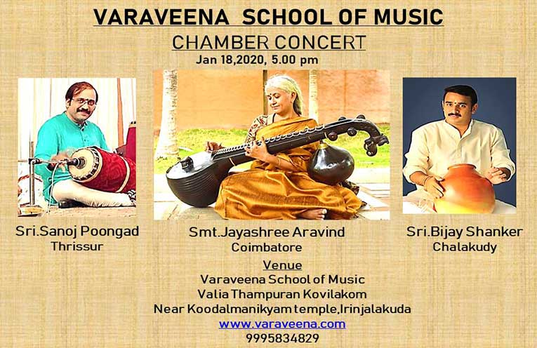 കൂടൽമാണിക്യം ക്ഷേത്രത്തിന് സമീപത്തെ വലിയതമ്പുരാൻ കോവിലകത്ത് വരവീണ സ്കൂൾ ഓഫ് മ്യൂസിക്കിന്റെ ആഭിമുഖ്യത്തിൽ ജനുവരി 18 ശനിയാഴ്ച വൈക്കീട്ട് 5 മണിക്ക് ജയശ്രീ അരവിന്ദ് (കോയമ്പത്തൂർ) വീണ കച്ചേരി അവതരിപ്പിക്കും. പക്കമേളത്തിൽ മൃദംഗം സനോജ് പൂങ്ങാട്, ഘടം ബിജയ് ശങ്കർ ചാലക്കുടി.