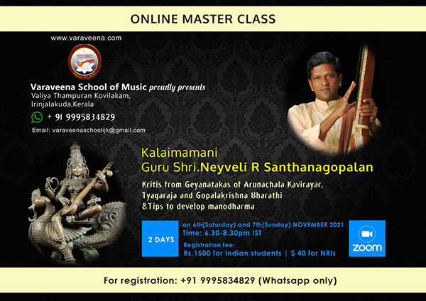 വരവീണ സ്കൂൾ ഓഫ് മ്യൂസിക്കിന്റെ ആഭിമുഖ്യത്തിൽ പ്രശസ്ത സംഗീതജ്ഞൻ കലൈമാമണി ഗുരു ശ്രീ .നെയ്വേലി R സന്താനഗോപാലൻറെ നേതൃത്വത്തിൽ ഓൺലൈൻ സംഗീത ശിൽപശാല 2022 ഫെബ്രുവരി 19 നും 20 നും വൈകീട്ട് 7.30 മുതൽ രാത്രി 9.30 വരെ Zoom പ്ലാറ്റുഫോമിൽ സംഘടിപ്പിക്കുന്നു. ഈ പരിപാടിയിലേക്കുള്ള വാട്സാപ്പ് മുഖേനയുള്ള രെജിസ്ട്രേഷൻ ആരംഭിച്ചിട്ടുണ്ട്. രജിസ്റ്റർ ചെയ്യുന്നതിനുള്ള നമ്പർ: 9995834829 . നവംബറിൽ ഇദ്ദേഹത്തിന്റെ തന്നെ നേതൃത്വത്തിൽ സംഘടിപ്പിച്ച ഓൺലൈൻ ശില്പശാല വൻ വിജയമായിരുന്നു. ഇത്തവണത്തെ ശില്പശാല, ഇതിൽ പങ്കെടുക്കുന്ന എല്ലാ സംഗീതപ്രേമികൾക്കും തന്നിലുള്ള സർഗാത്മകമായ സംഗീത പ്രാവീണ്യം കണ്ടെത്താനുള്ള ഒരു വഴിത്തിരിവാകുമെന്നാണ് പ്രതീക്ഷിക്കുന്നത്.
