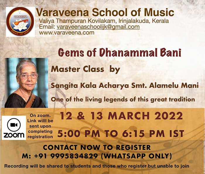 വരവീണ സ്കൂൾ ഓഫ് മ്യൂസിക്കിന്റെ ആഭിമുഖ്യത്തിൽ പ്രശസ്ത സംഗീത കല ആചാര്യ ശ്രീമതി .അലമേലു മണിയുടെ നേതൃത്വത്തിൽ ഓൺലൈൻ സംഗീത ശിൽപശാല 2022 മാർച്ച് 12 നും 13 നും വൈകീട്ട് 5 മുതൽ 6.30 വരെ Zoom പ്ലാറ്റുഫോമിൽ സംഘടിപ്പിക്കുന്നു. ഈ പരിപാടിയിലേക്കുള്ള വാട്സാപ്പ് മുഖേനയുള്ള രെജിസ്ട്രേഷൻ ആരംഭിച്ചിട്ടുണ്ട്. രജിസ്റ്റർ ചെയ്യുന്നതിനുള്ള നമ്പർ: 9995834829. രെജിസ്ട്രേഷൻ ഫീ: 1200 INR (ഫോർ ഇന്ത്യൻ റെസിഡന്റ്സ് ) , 30 $ (NRIs)
