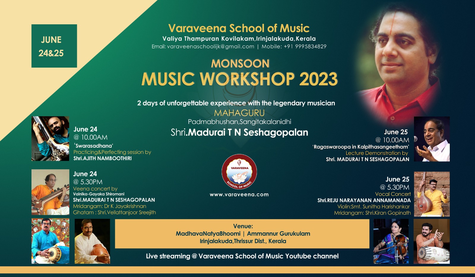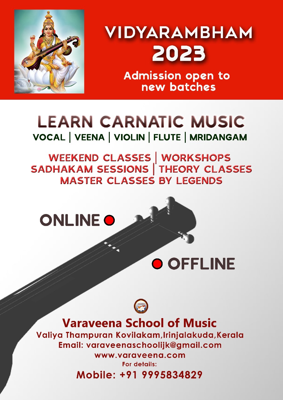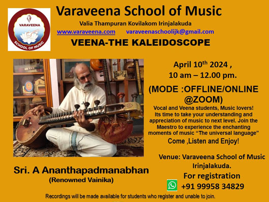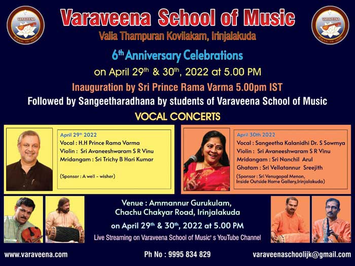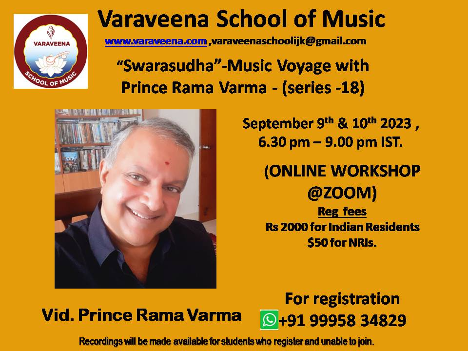 Varaveena School of Music, Irijnalakuda, to organize their 15th Teaching Session with Prince Rama Varma on Saturday and Sunday, the 27th and 28th of August, 2022, from 6:30pm to 9:00pm IST. Please contact +919995834829 for registration.
