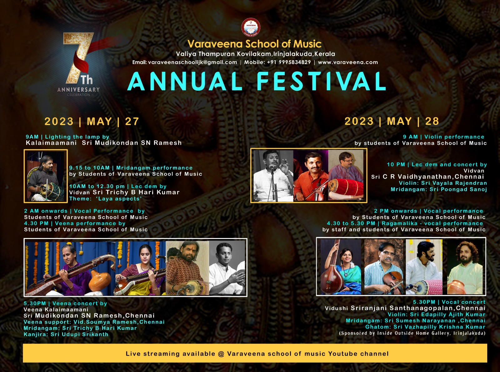 കൂടൽമാണിക്യം ക്ഷേത്രത്തിനു സമീപം വലിയതമ്പുരാൻ കോവിലകം ആസ്ഥാനമായി പ്രവർത്തിക്കുന്ന വരവീണ സ്കൂൾ ഓഫ് മ്യൂസിക്കിന്റെ രണ്ടാം വാർഷികം ജനുവരി 26 ന് ഉണ്ണായിവാര്യർ സ്മാരക കലാനിലയത്തിൽ ആഘോഷിക്കും. വാർഷികാഘോഷങ്ങളുടെ ഭാഗമായി വൈകീട്ട് 4 മണിക്ക് വരവീണയിലെ വിദ്യാർത്ഥികൾ അവതരിപ്പിക്കുന്ന സംഗീതാർച്ചന ഉണ്ടാകും.5 .15 കേരള കലാമണ്ഡലത്തിൽ നിന്നും ഡോക്ടറേറ്റ് ബിരുദം നേടിയ കെ ജയകൃഷ്ണന് സ്നേഹാദരണം നൽകുന്നു. 5.30 നാദോപാസനയുടെ സഹകരണത്തോടെ വരവീണ സ്കൂൾ ഓഫ് മ്യൂസിക് അവതരിപ്പിക്കുന്ന ചെന്നൈ വിഷ്ണുദേവ് നമ്പൂതിരിയുടെ സംഗീതക്കച്ചേരി ഉണ്ടാകും. സംഗീതക്കച്ചേരിയിൽ തിരുവിഴ വിജു എസ് ആനന്ദ് വയലിനും ഡോ കെ ജയകൃഷ്ണൻ മൃദംഗവും വെള്ളാറ്റഞ്ഞൂർ ശ്രീജിത്ത് ഘടത്തിലും.